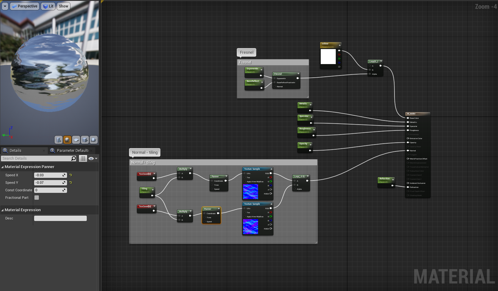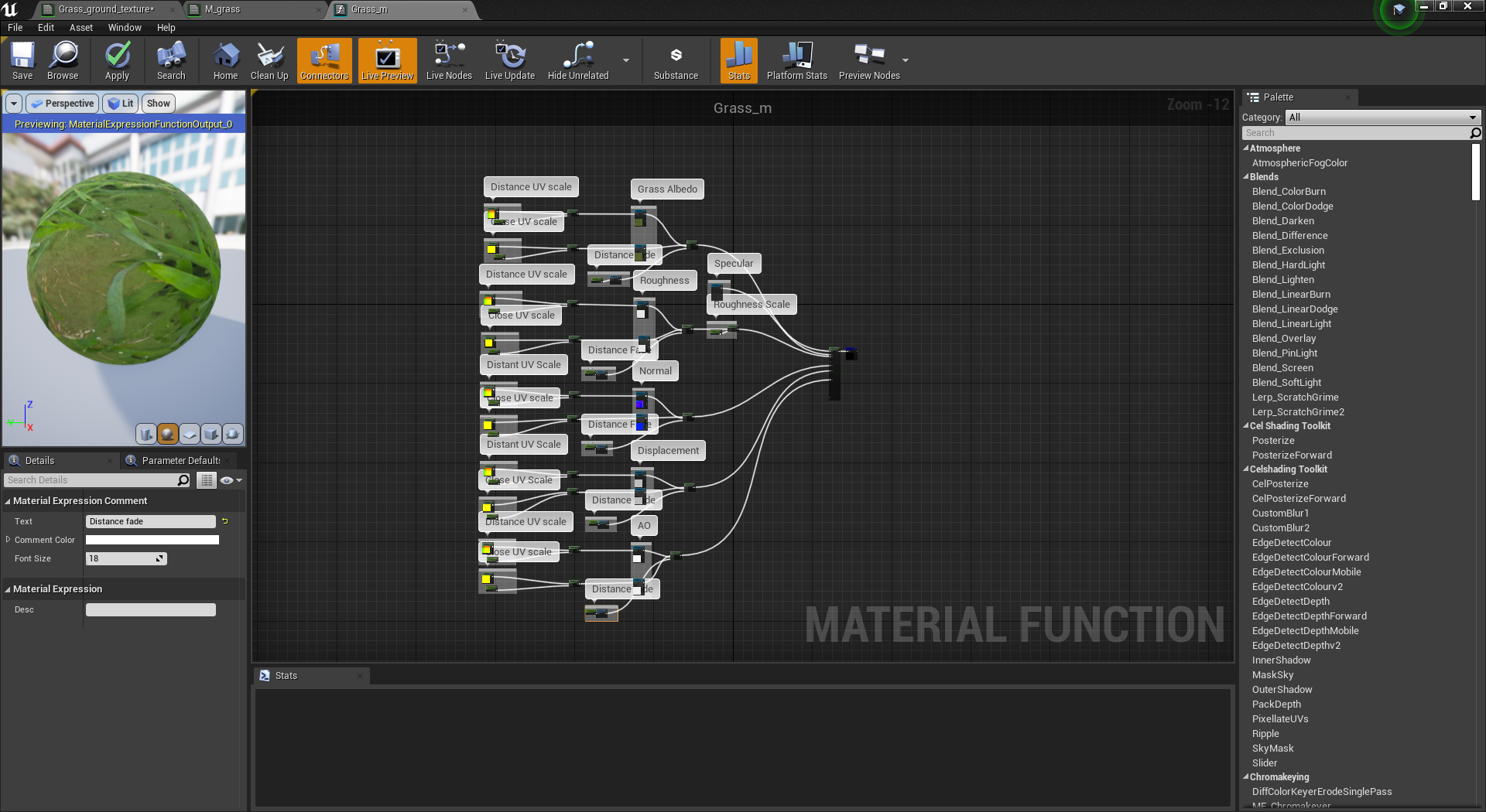 Being the master material I needed a dynamic/flexible solution to the intricacies of the distance UV scaling. Creating calls to the material functions meant I could easily visualise and blueprint the blends from each texture. These textures are pulled out from break attribute nodes for each blend based on the landscape height map and cant also be custom painted. Further implementation of the grass asset are placed only where explicit grass normal's are present.
