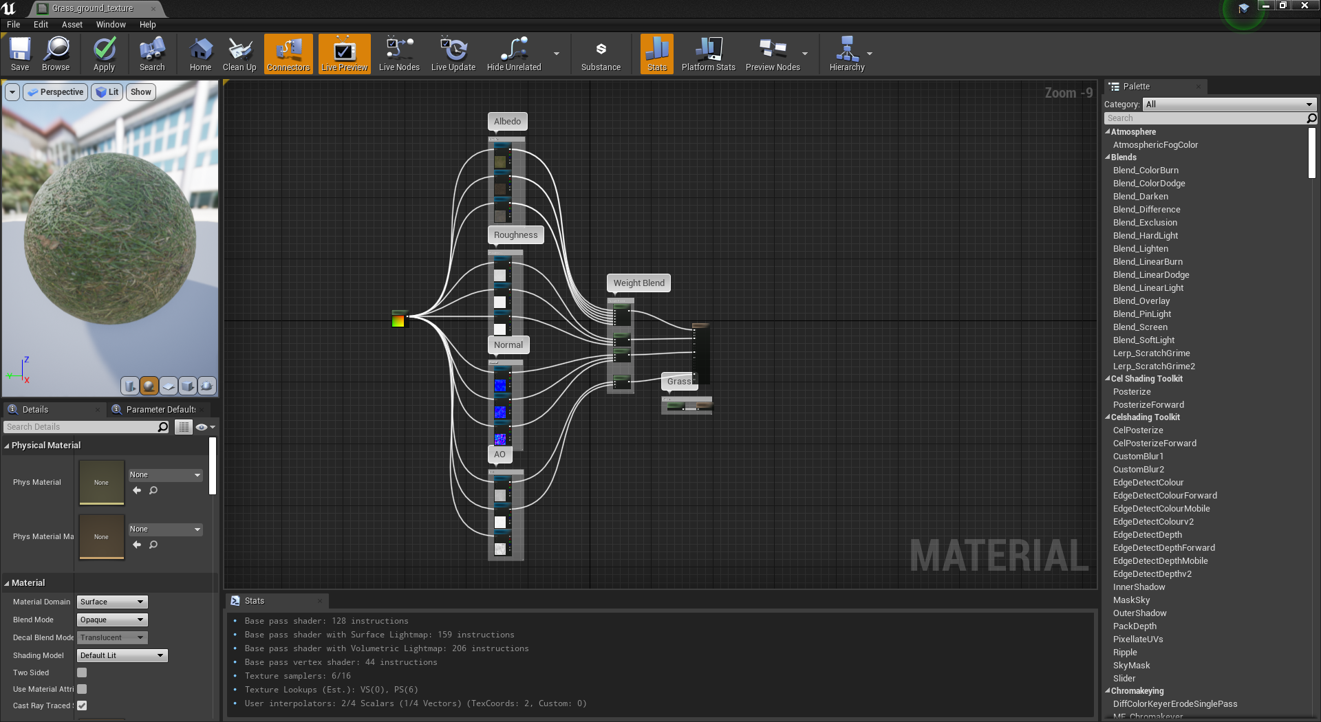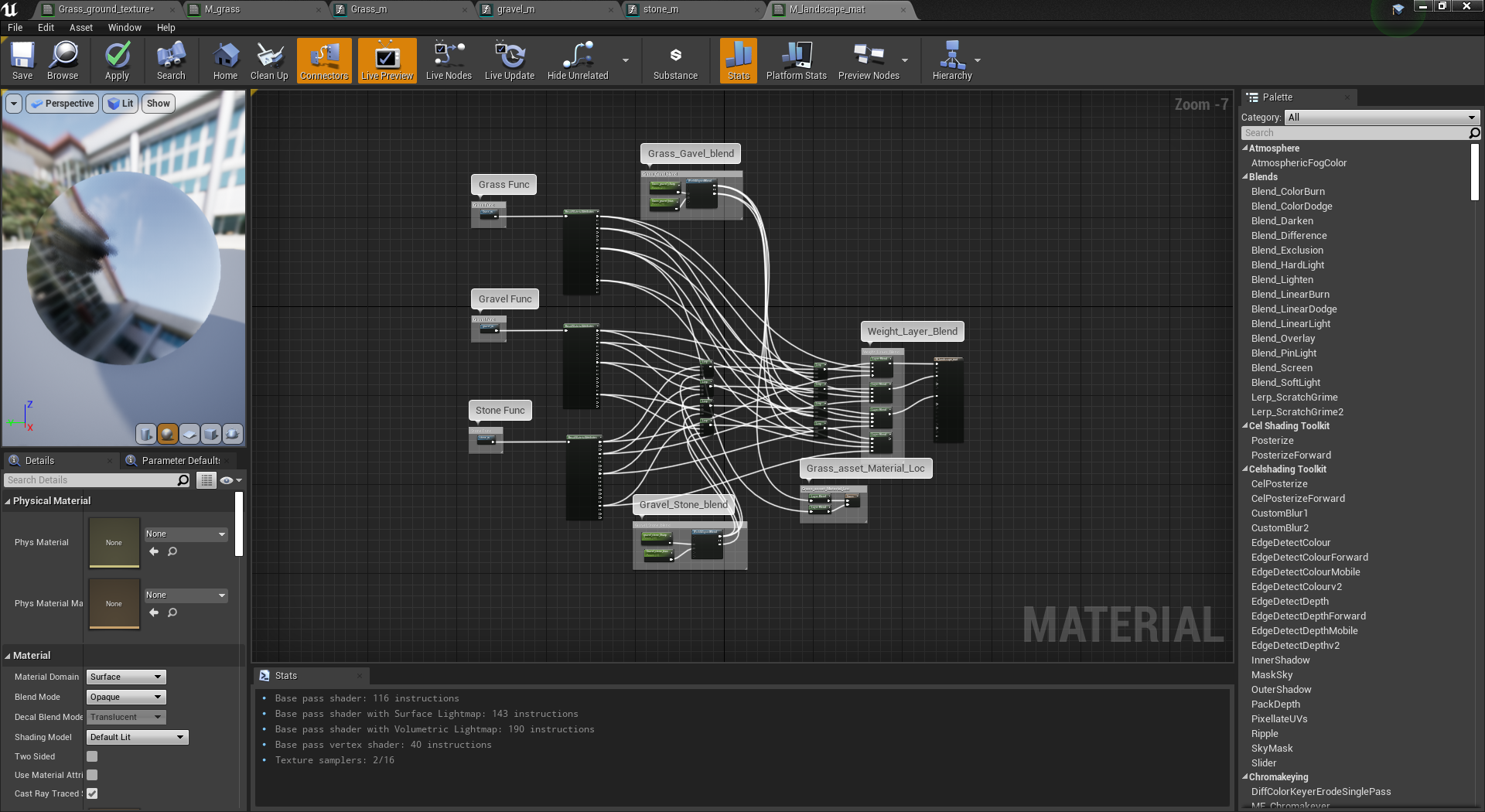 Implementation of a ground master material has worked out well - This material consists of grass, gravel and stone textures. The master connects the individual functions for each texture allowing for alterations to occur in each textre rather than changing the master node setup.