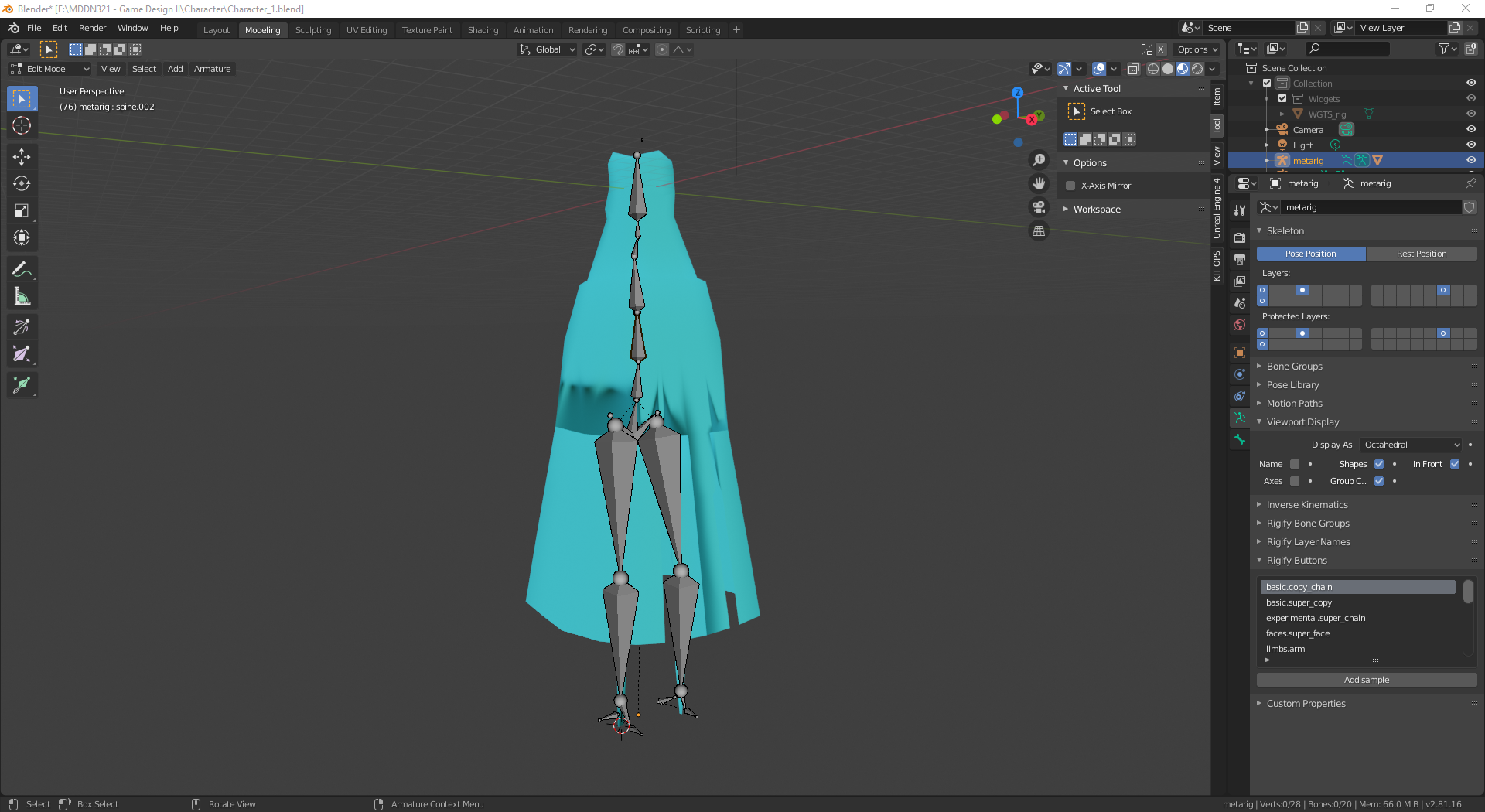 Character prototyping - based on the main character in Journey. This is a simple mesh with cloth simulation in Unreal in mind. Basic armature has been created although Importing to unreal is not application at this stage as the bone structure does not match Unreal requirements.