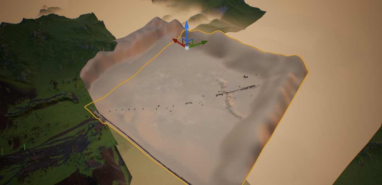 Having time catch up I decided to only create the landscape in the persistent level and remove the initial first cut scene and the cottage house. This landscape was made it World machine and then sculpted so the player cannot leave the zone and only progress into the next section. A basic sand texture from Megascans was applied. To finalise the sand dune zone I have placed indicators and functional shade for the player to be under as they progress.