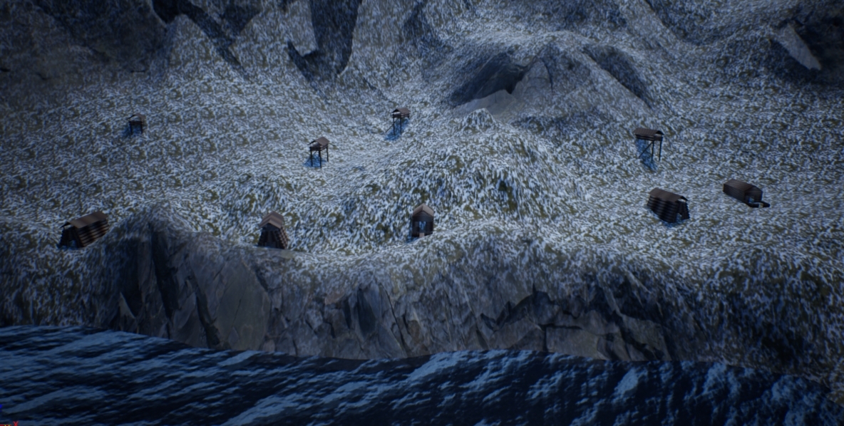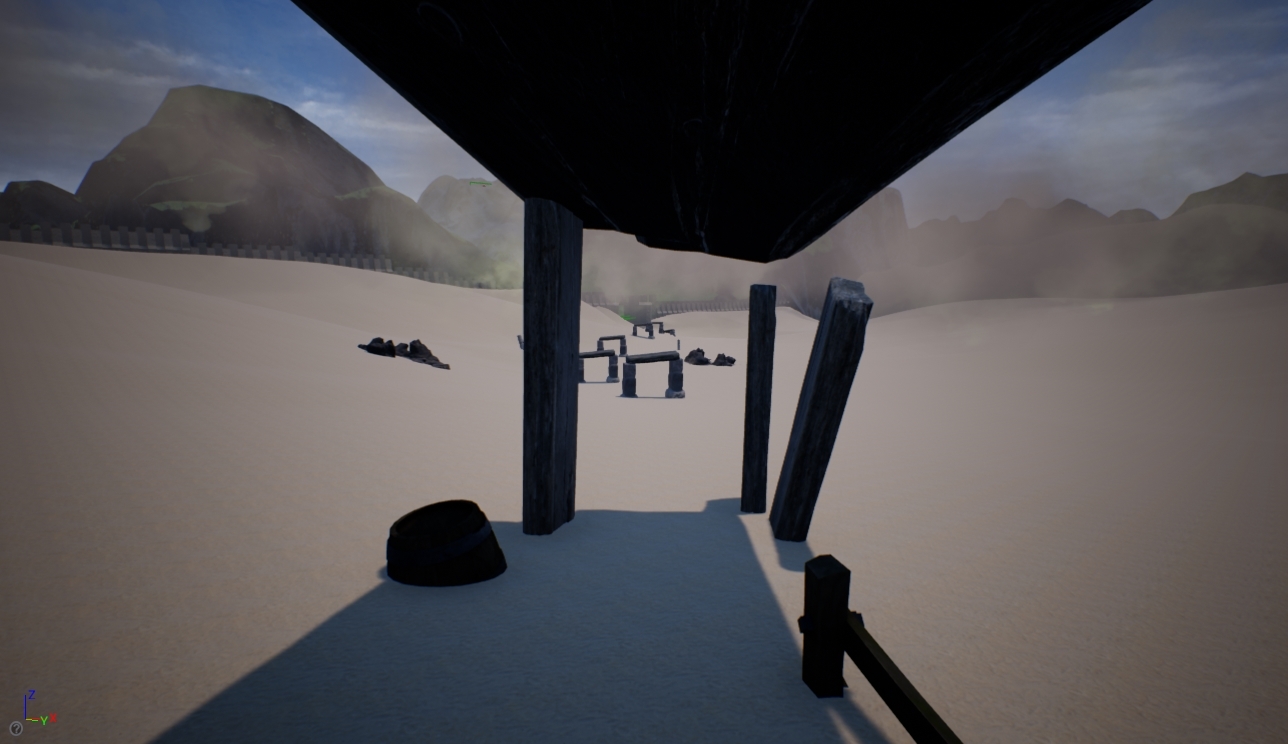 This is the first village the player comes across after the sand dunes where the player will collect their first orb. Using the advanced village pack from the Unreal Marketplace, I have placed buildings and various accompanying assets to create a believable small village. Particle effects such as leaves and bugs/dust and smoke have also been added to add to the overall composition of the village. In the center of the village I have placed a shrine where the purple orb is placed for the player to collect. Sculpting the material blends around the village meant applying gravel and grass appropriately. Warren has done an amazing job at creating the orbs and accompanying cinematic camera template for later implementation.