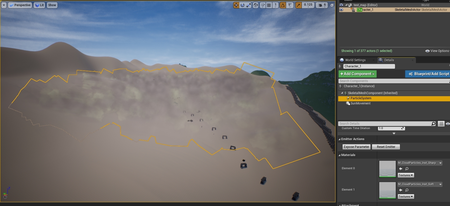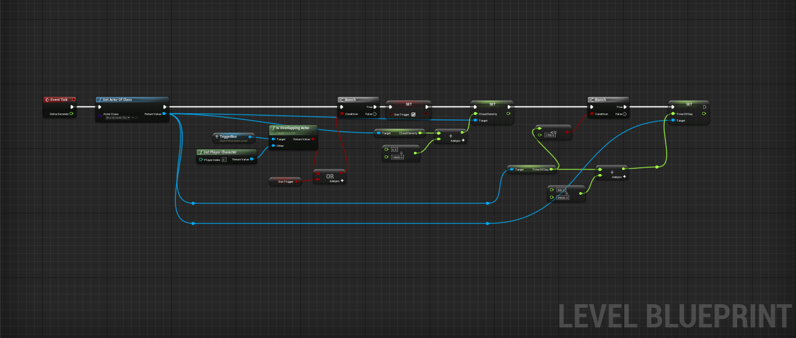 Me and Asher have added a system from the Ultra dynamic sky component in the level blueprint that changes the cloud density as the player progresses through the game. In the sand dunes the sun is fully exposed which matches the sun movement component. The player hits a trigger box after the sand dunes that slowly increases the cloud density so when they reach the rain trigger box, visually, the rain starts when their is dense clouds. this is subtly enough that can go unnoticed but if noticed adds well to the overall dynamic weather that is at the games core.