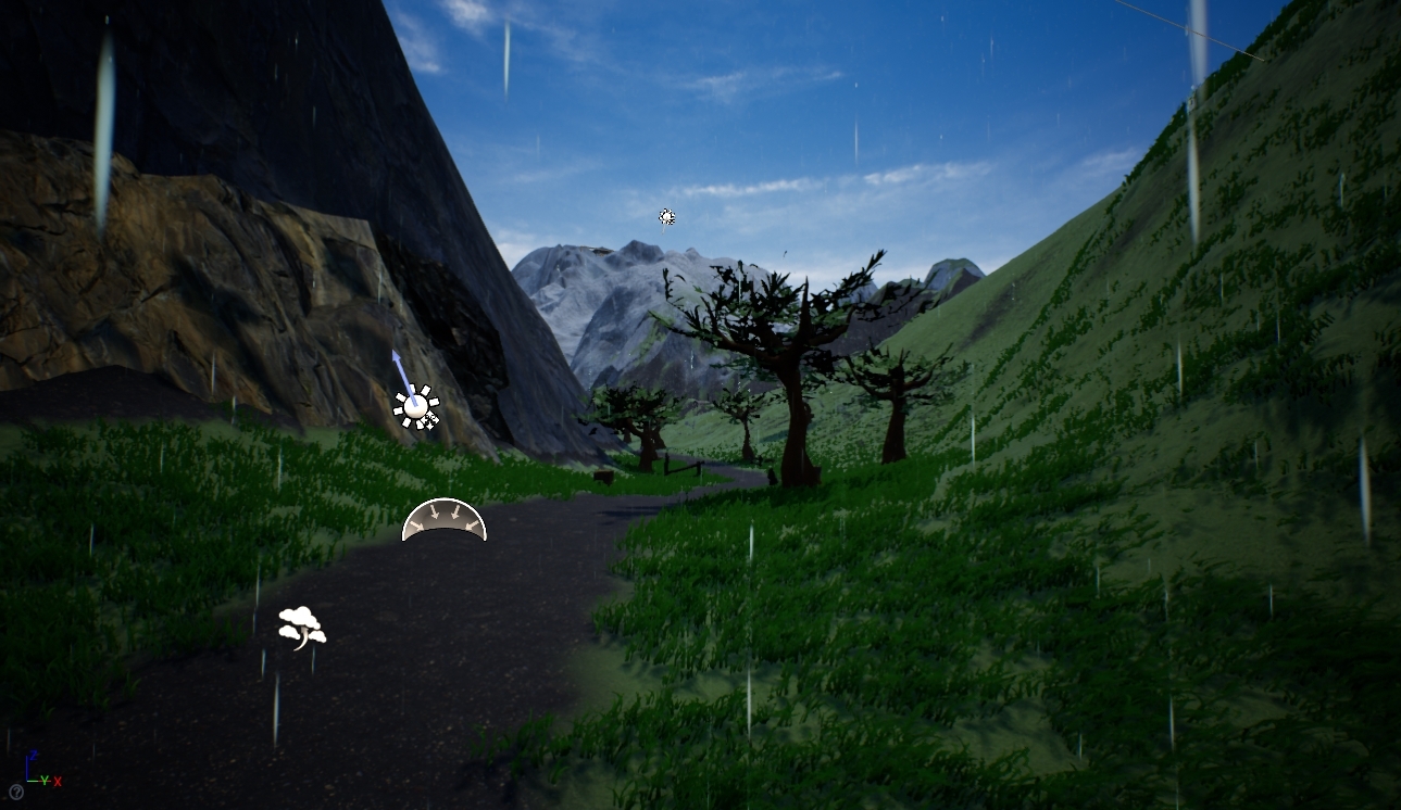 Moving on from the village, Melina's rain is added as a visual effect that adds to the journey. This has no impact of the players movement as we ran out of time - it is used to add to the visual aspects of the weather component.