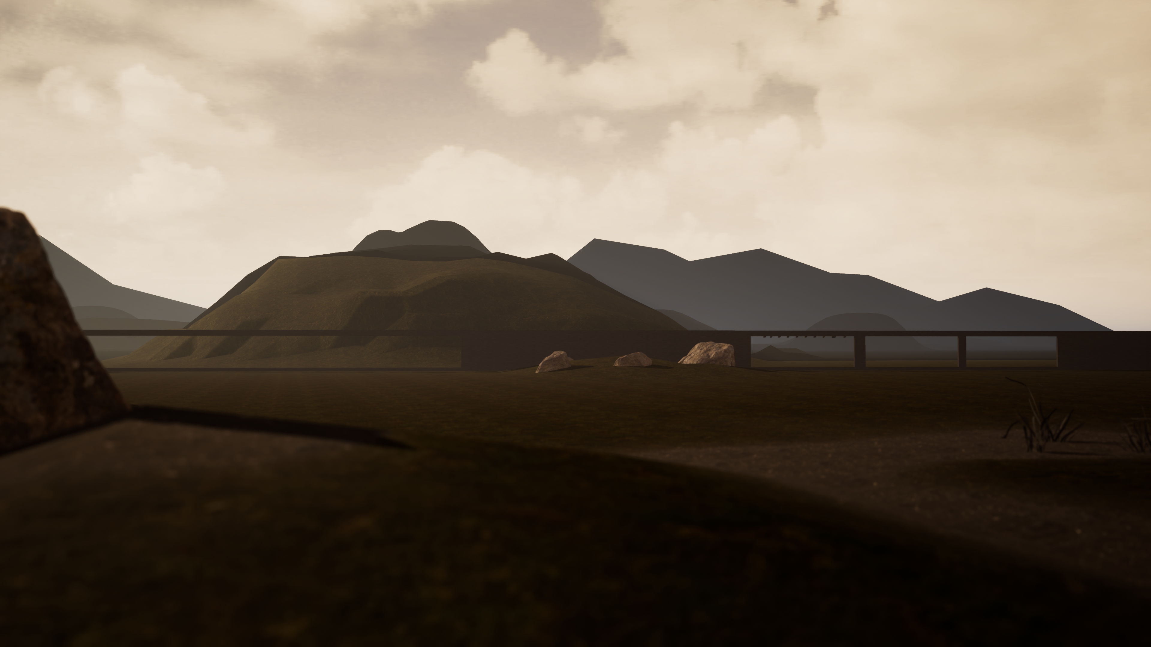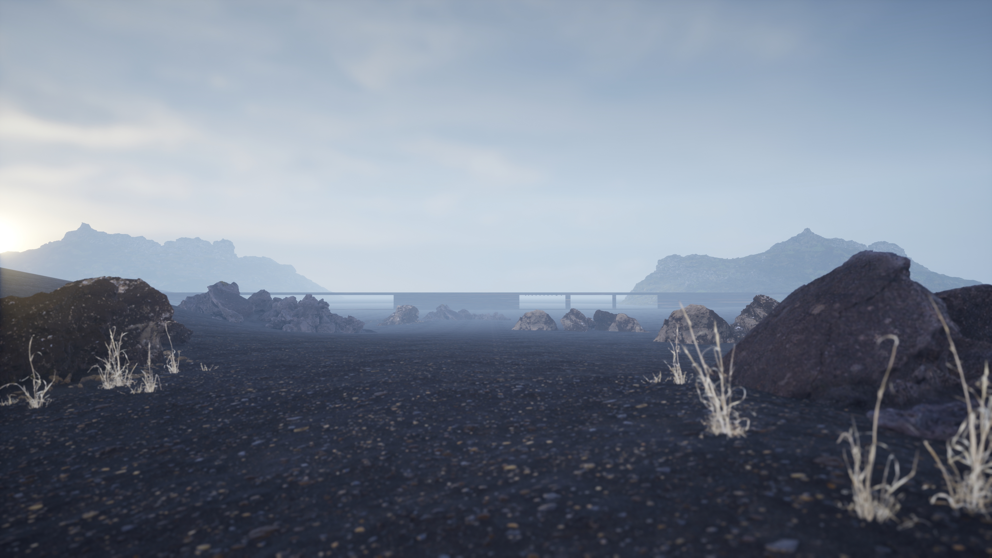 This baron landscape consists of a rugged mountain range with scattered rock and dead grass. The main motif of this scene is the main bridge-way, a custom 3D asset made in Maya. Volumetric fog sold the scene adding depth and atmosphere bringing together the light and landscape.